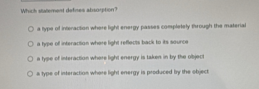 Solved: Which statement defines absorption? a type of interaction where ...