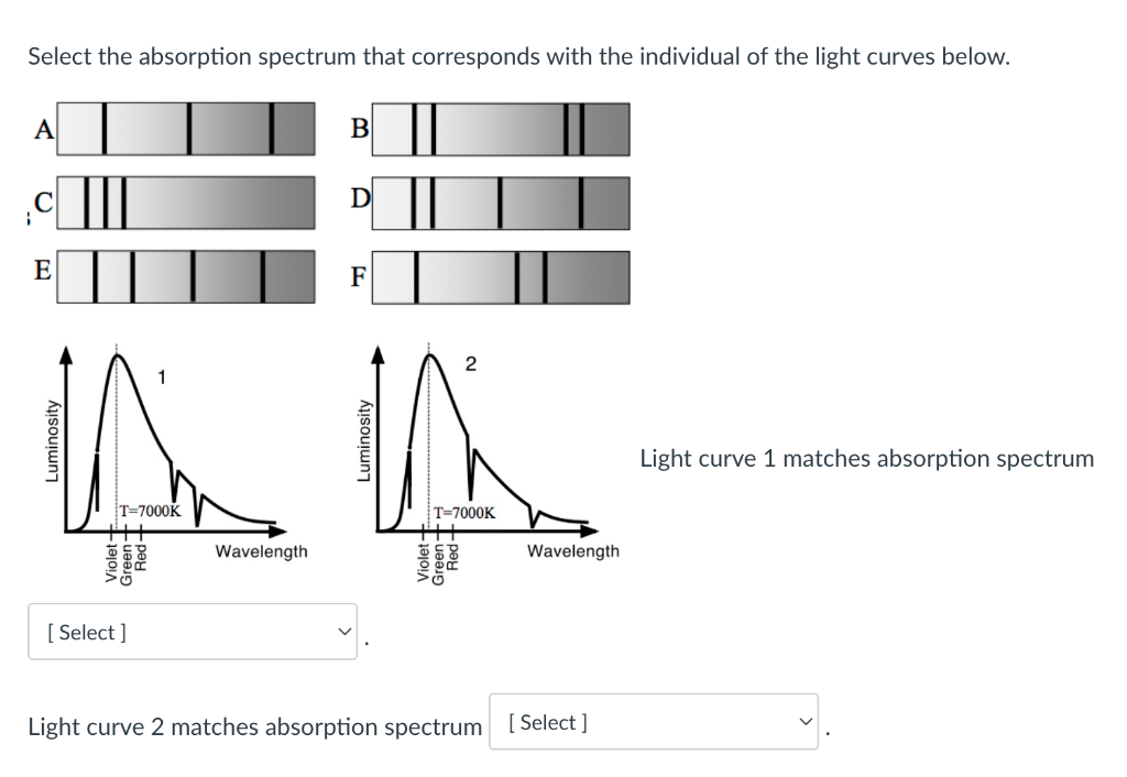 Question 1 2 pts Match the three absorption spectra of stars A, B, and ...
