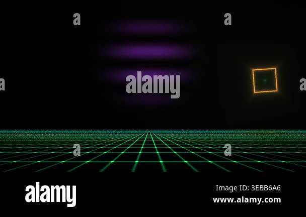 Glowing geometric shapes animation over neon grid and wireframe ...