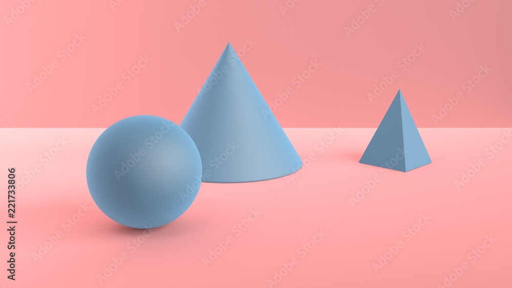 Abstract scene of geometric shapes. Ball, cone, and pyramid blue. Soft ...