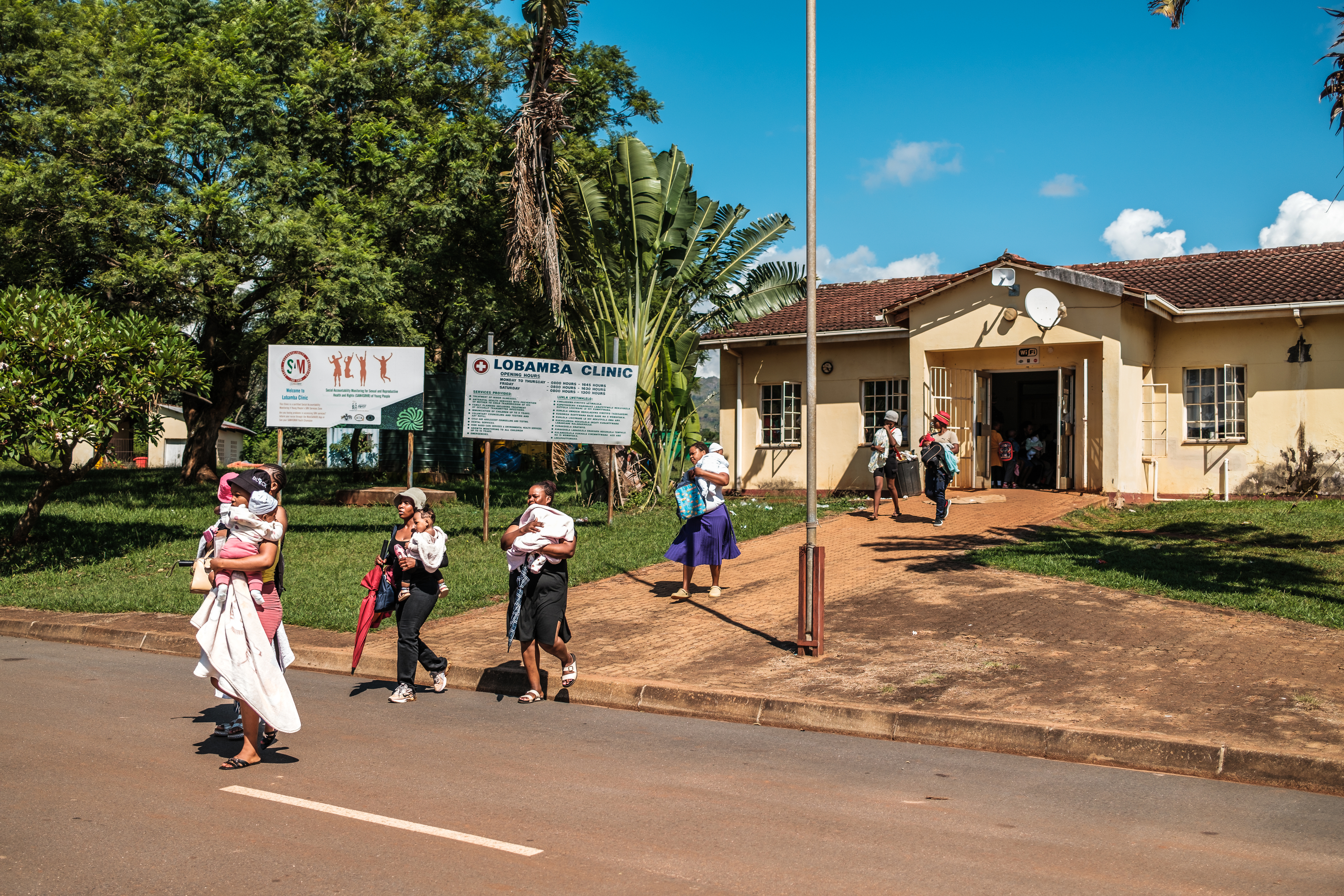 Women with infants approach Lobamba Clinic in Eswatini on a sunny day ...