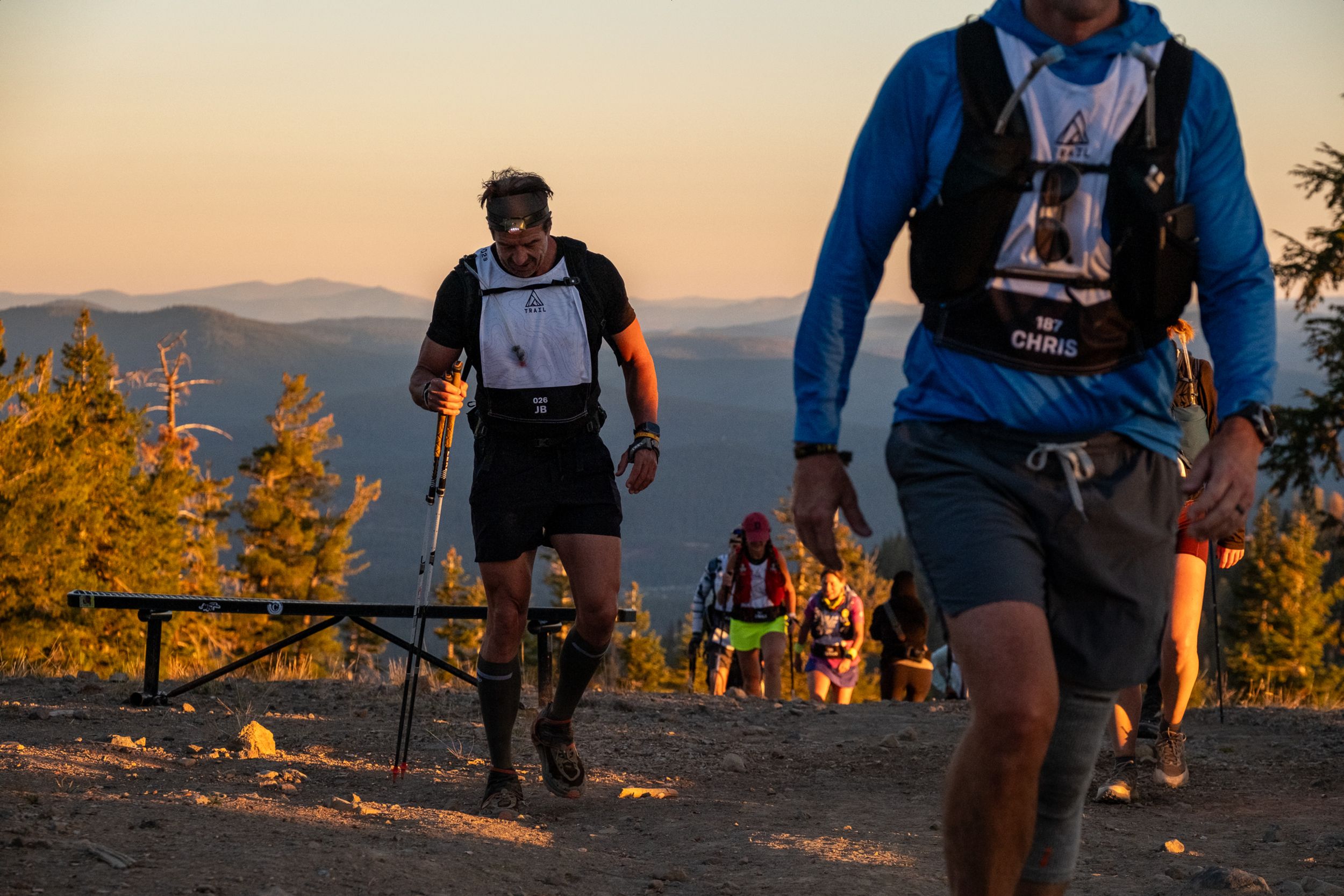 Trail runners ascend a dirt path at sunset. In the foreground, a runner ...