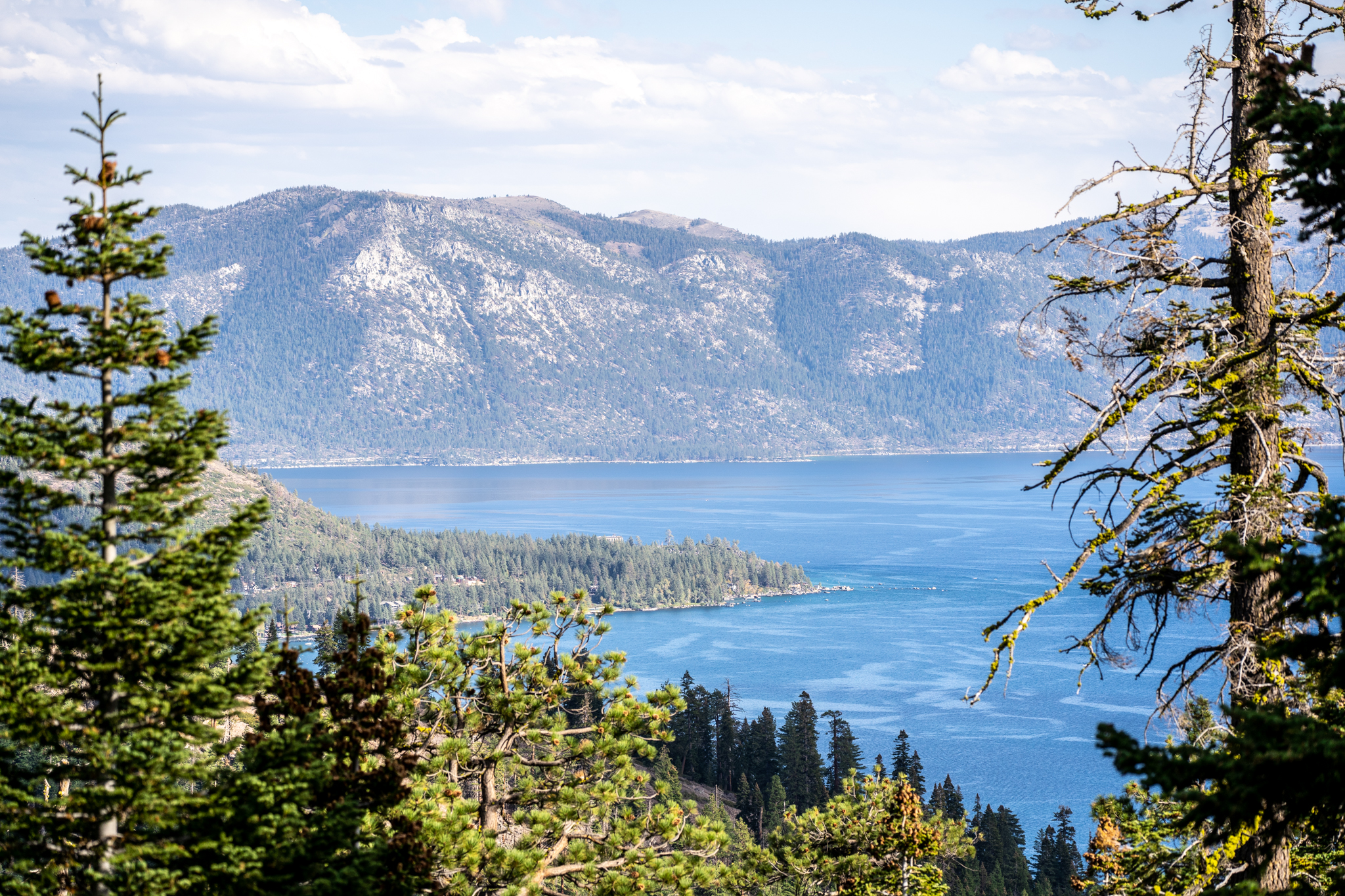 Lake Tahoe vista shows blue water surrounded by green forest and snow ...