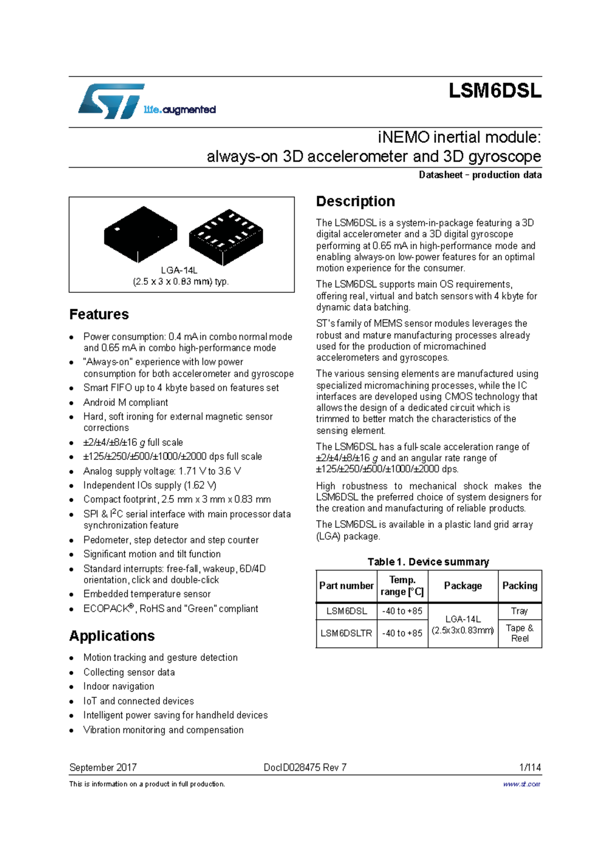LSM6DSL iNEMO Module: 3D Accel & Gyro Lecture Notes - Studocu