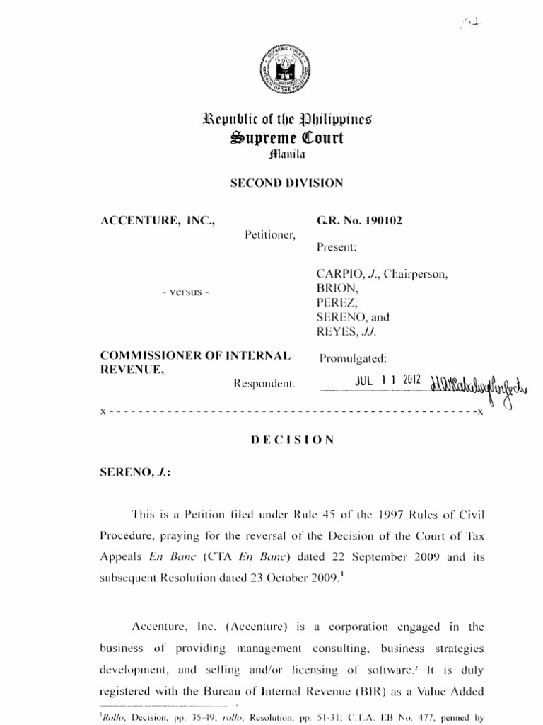 Accenture V Commissioner, GR 190102, July 11, 2012 | PDF | Value Added ...
