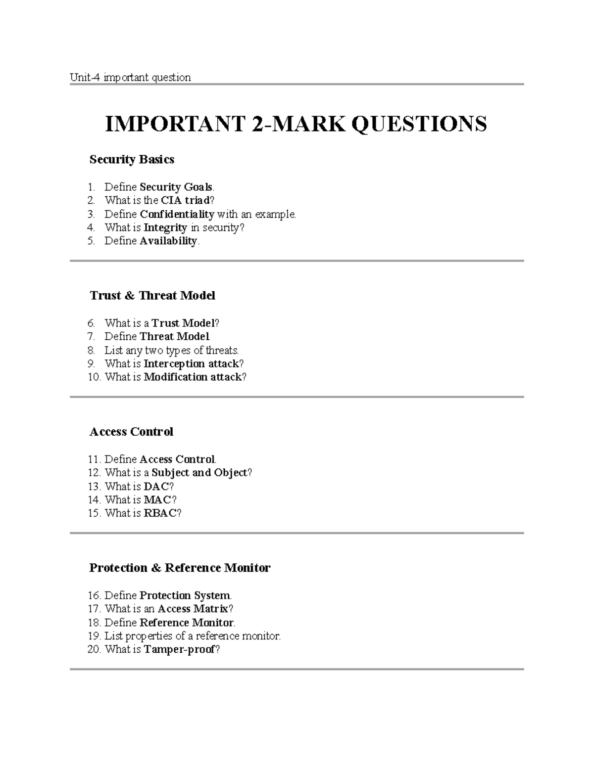 Unit 4: Important Questions on Security Fundamentals (2 & 16 Marks ...