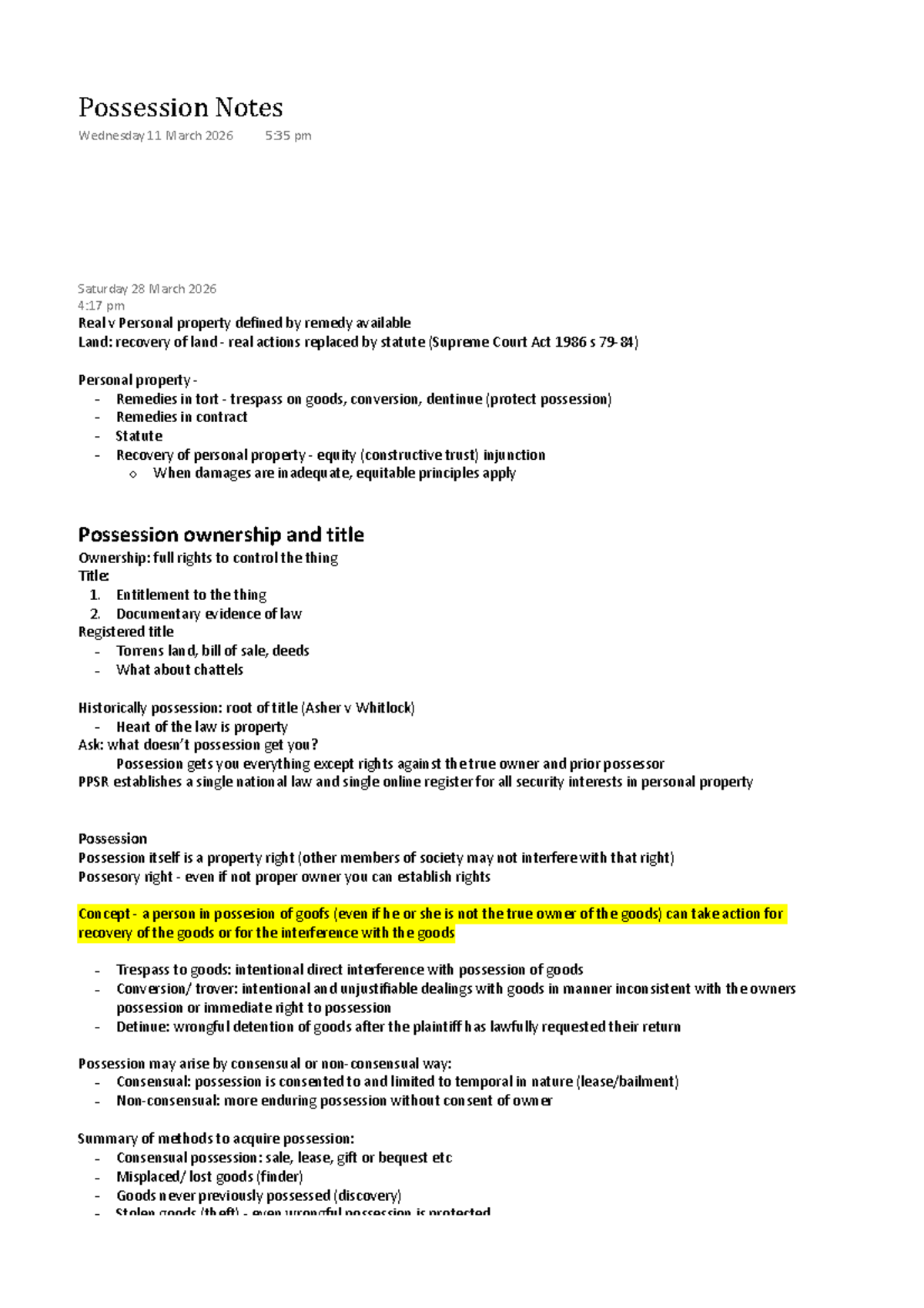Possession Notes: Understanding Real and Personal Property Rights - Studocu