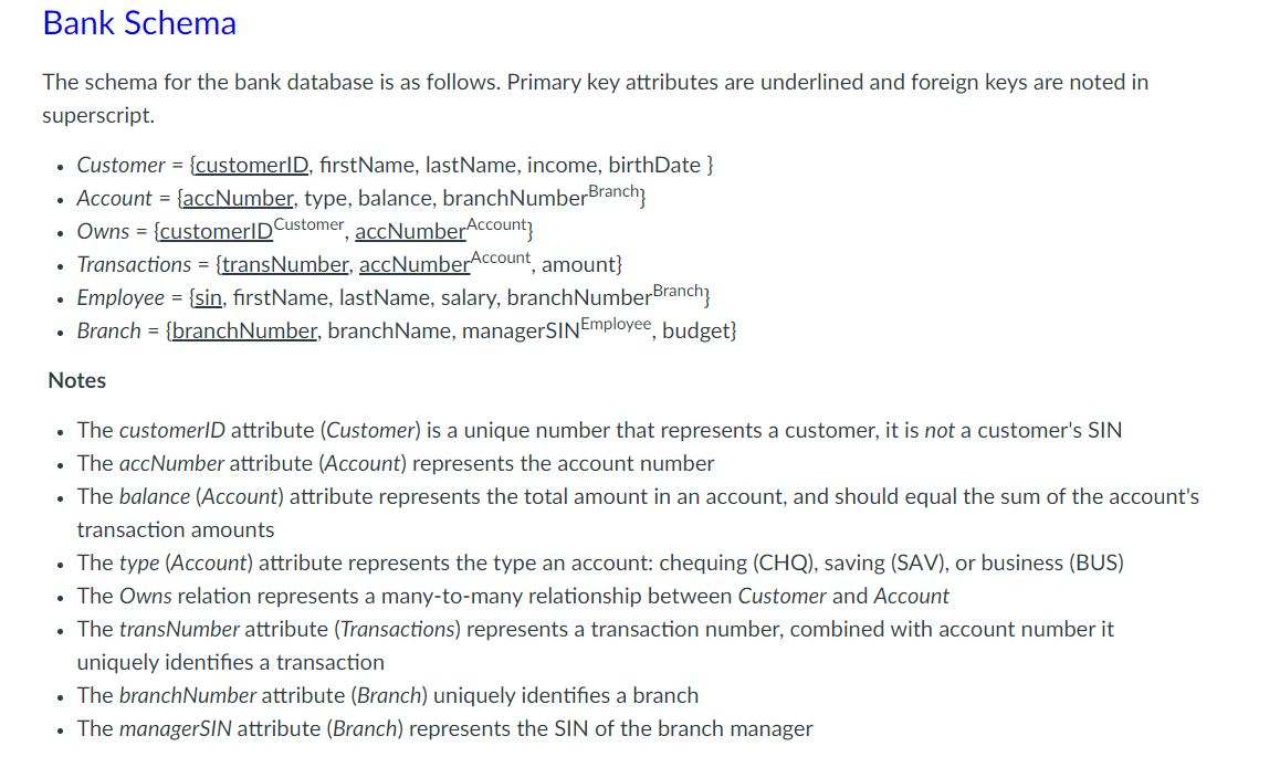 Solved Bank Schema The schema for the bank database is as | Chegg.com
