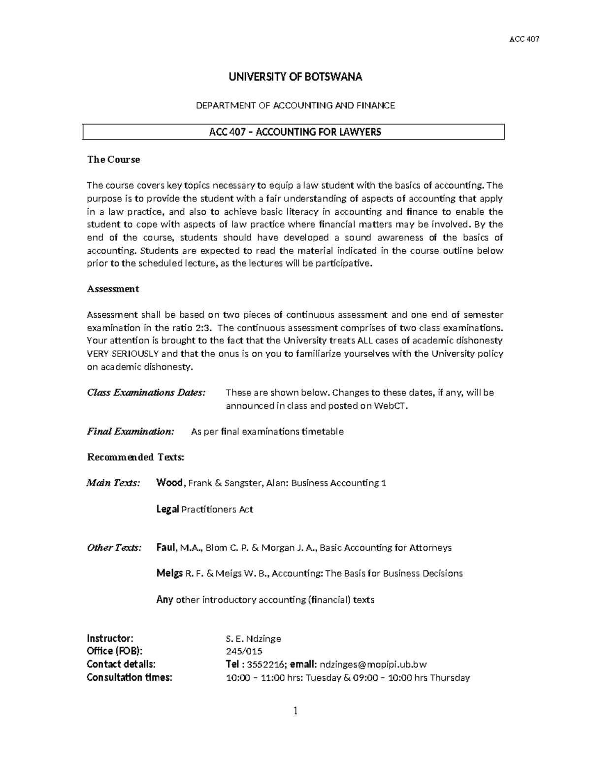ACC 407 Course Outline: Accounting for Lawyers 2015 - Studocu