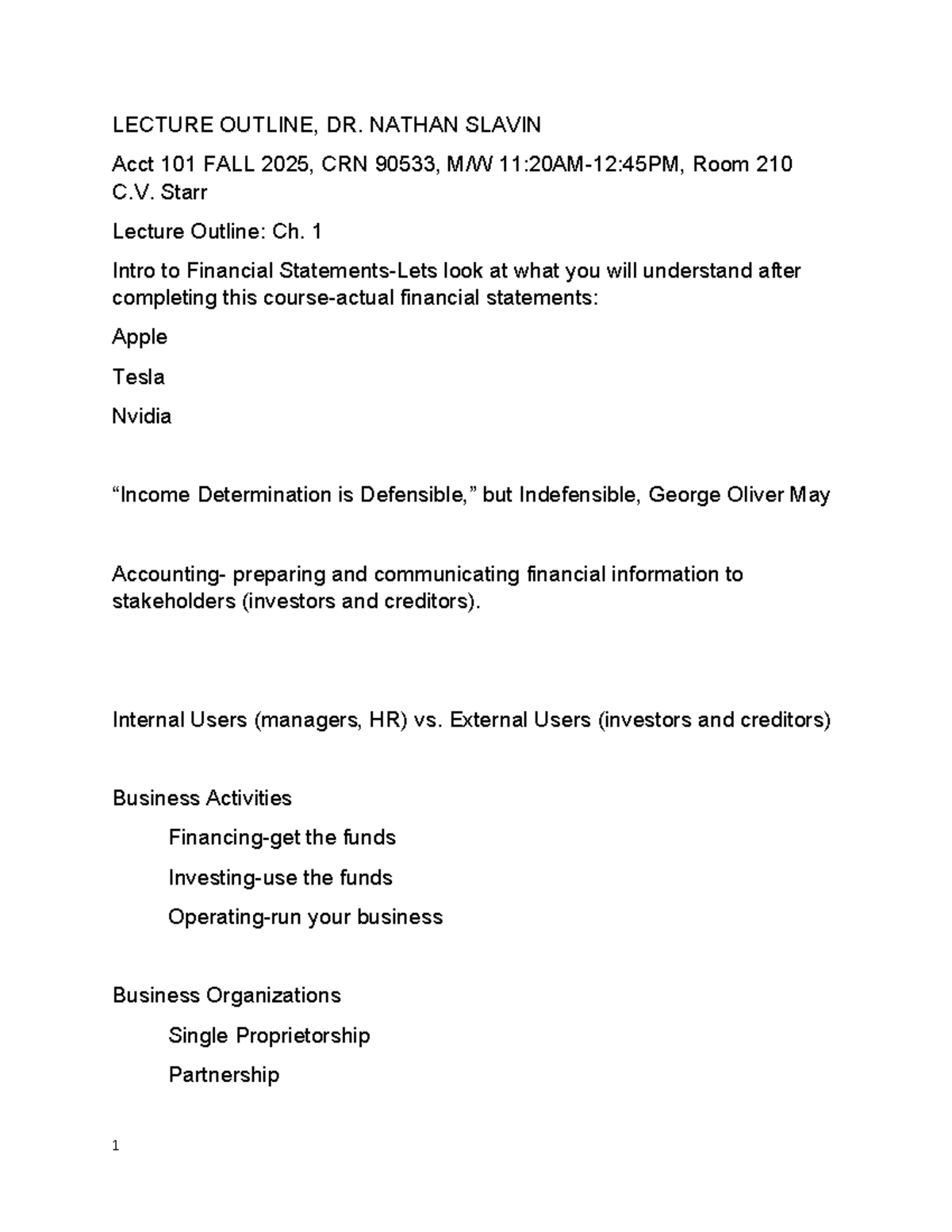 Acct 101 Lecture Outline: Intro to Financial Statements - Studocu