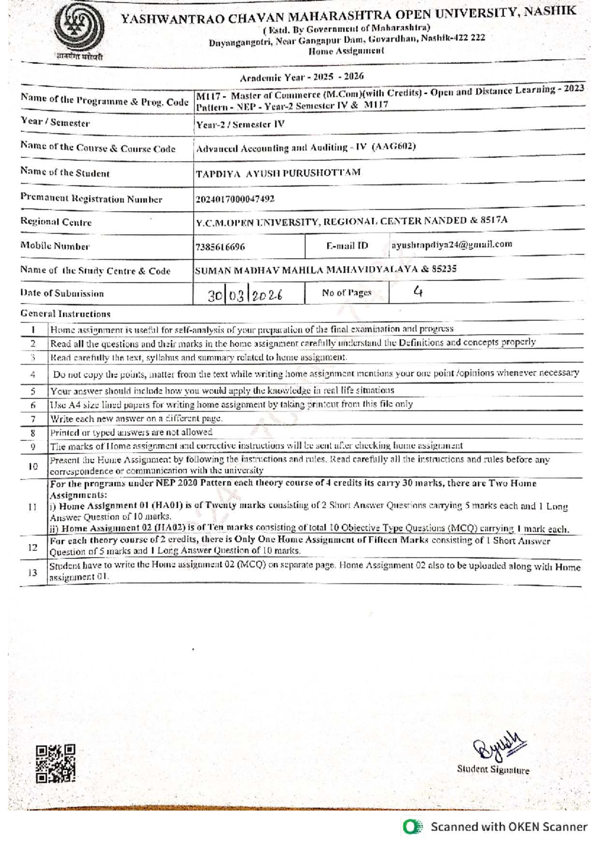 Advanced Accounting and Auditing Home Assignment M.Com AAG602 Sem IV ...