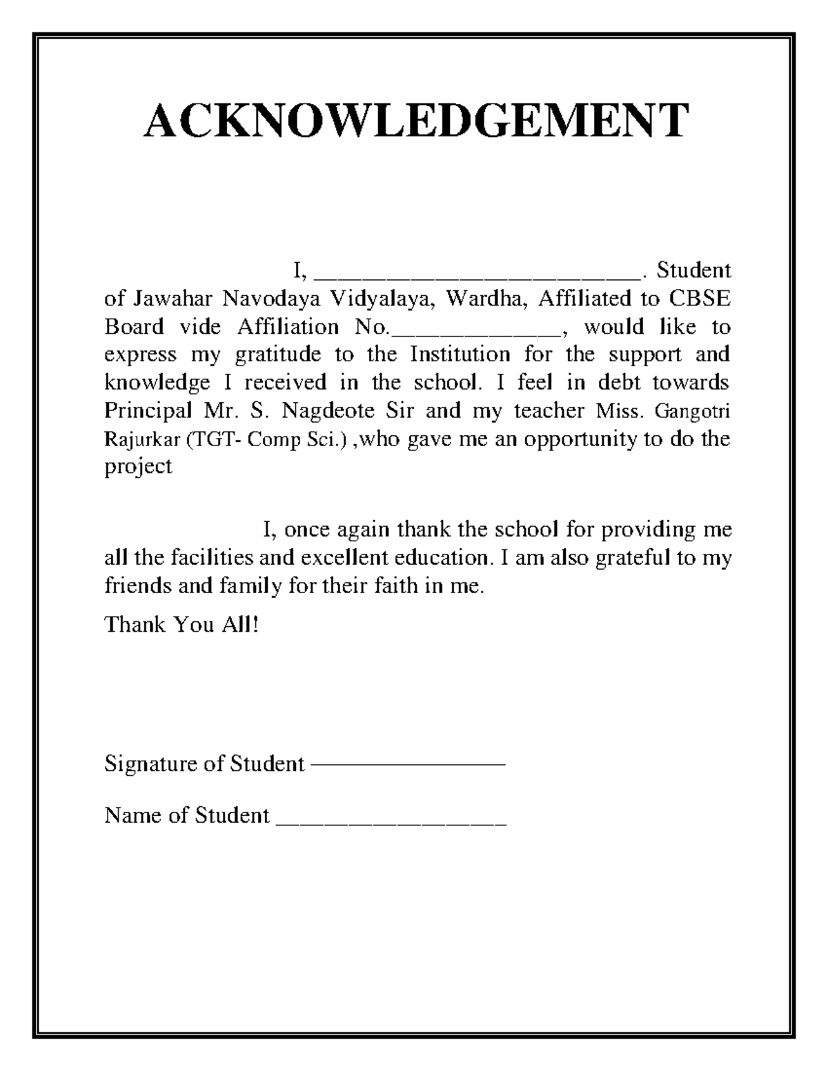 Acknowledgement for Practical File in College Projects: Recognizing ...