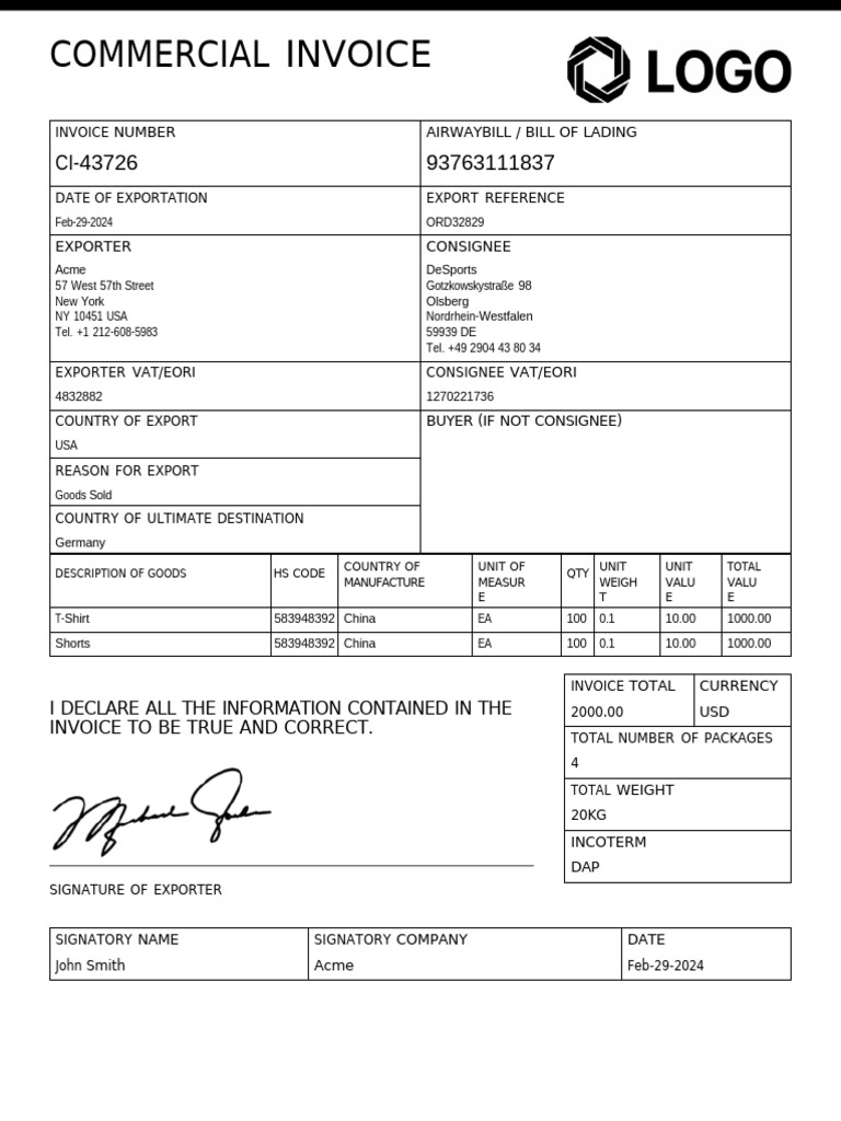 Commercial Invoice for Acme Export to Germany | PDF | Freight Transport ...