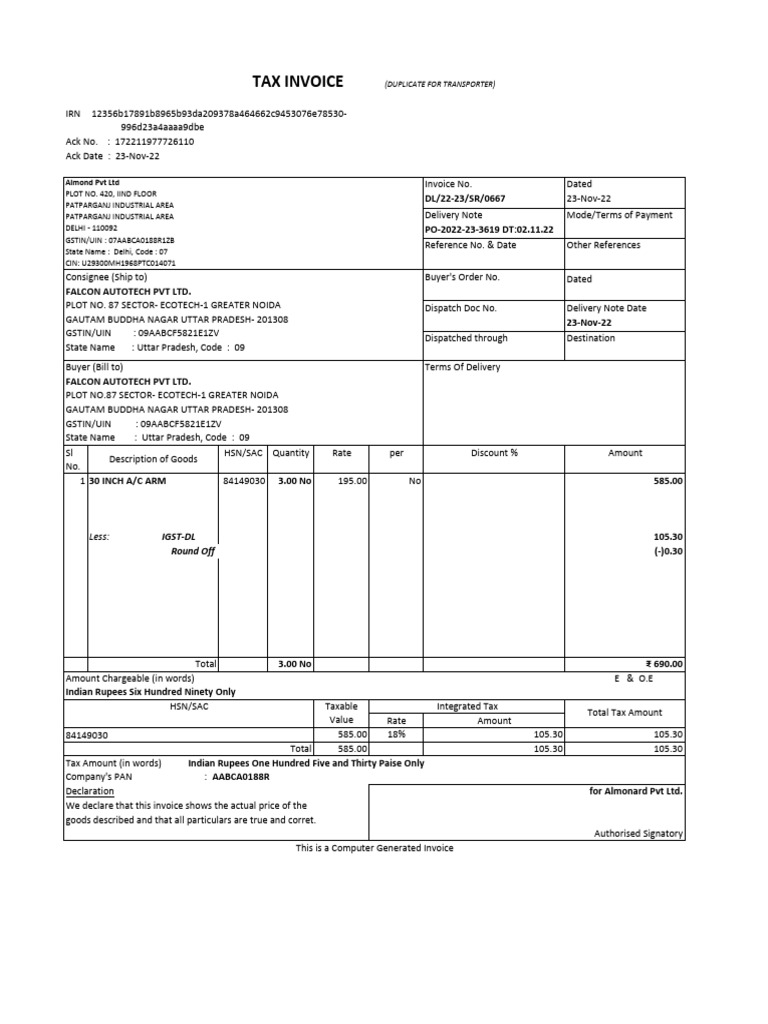 Invoice for 30 Inch A/C Arm Purchase | PDF | Invoice | Financial Markets