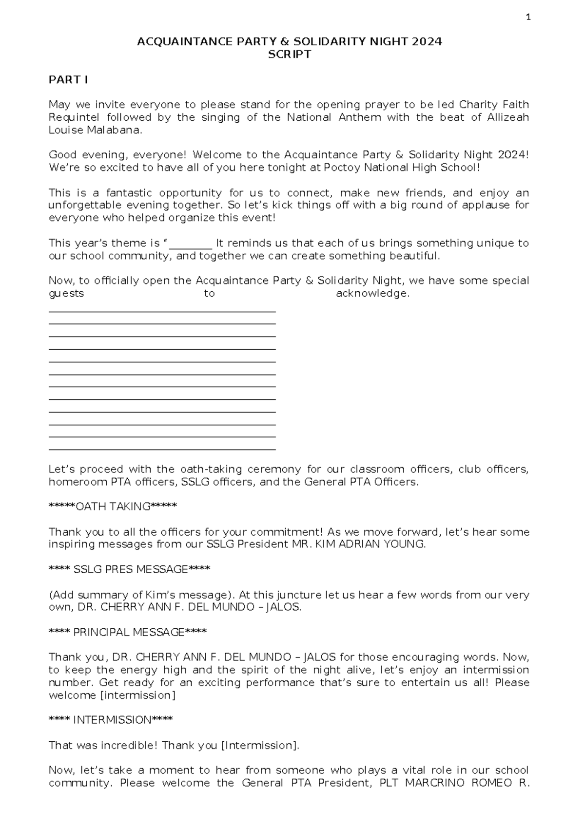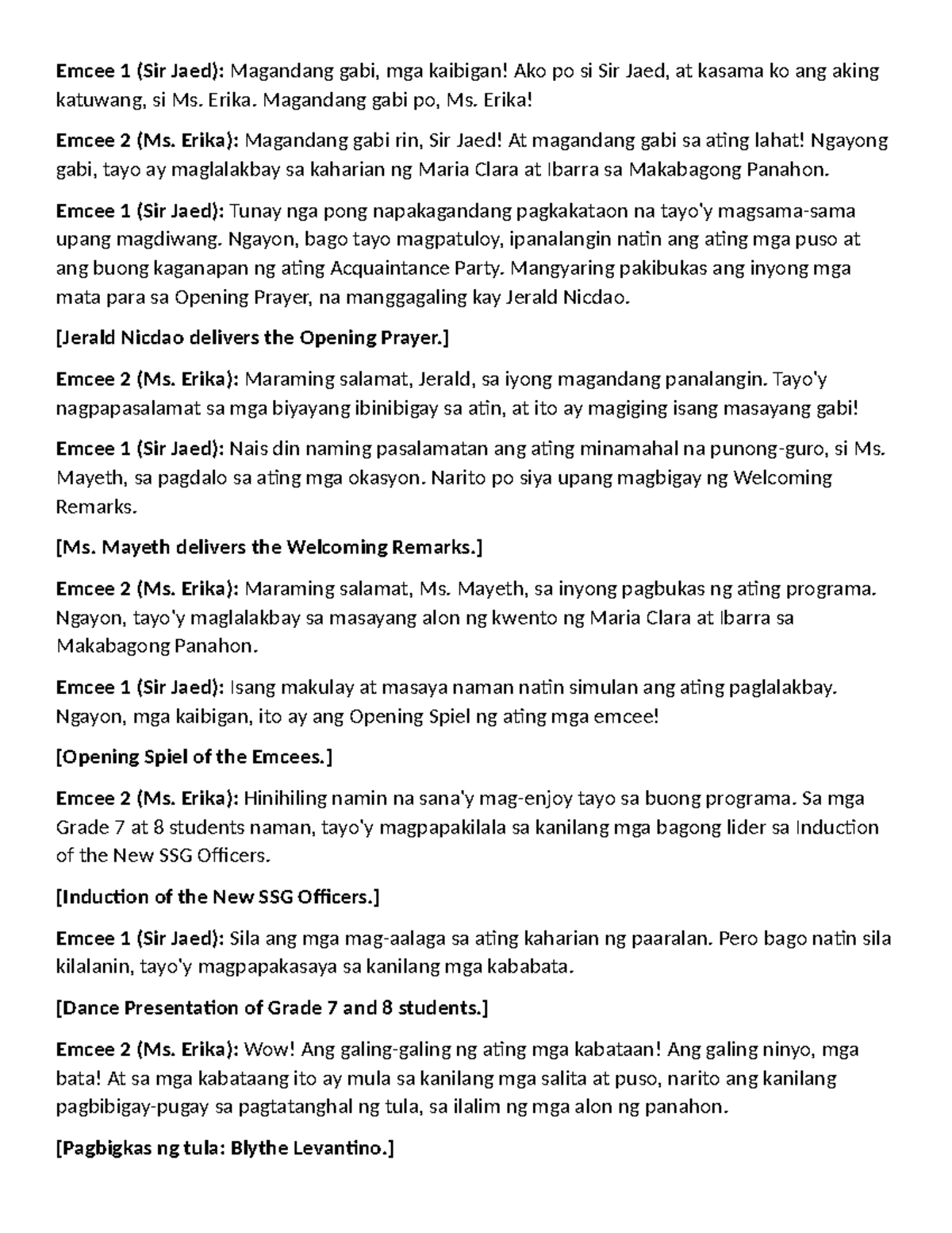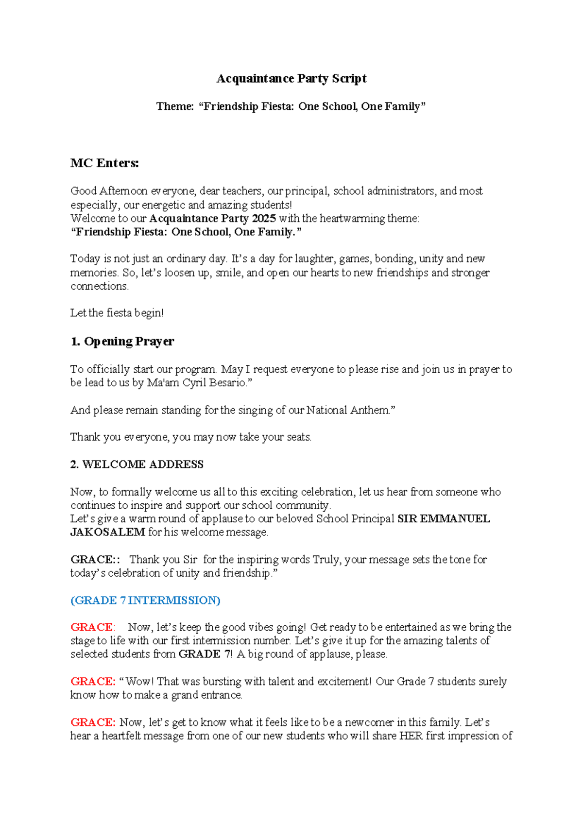 Emcee Script for Acquaintance Party: Grade 7-11 Celebration - Studocu