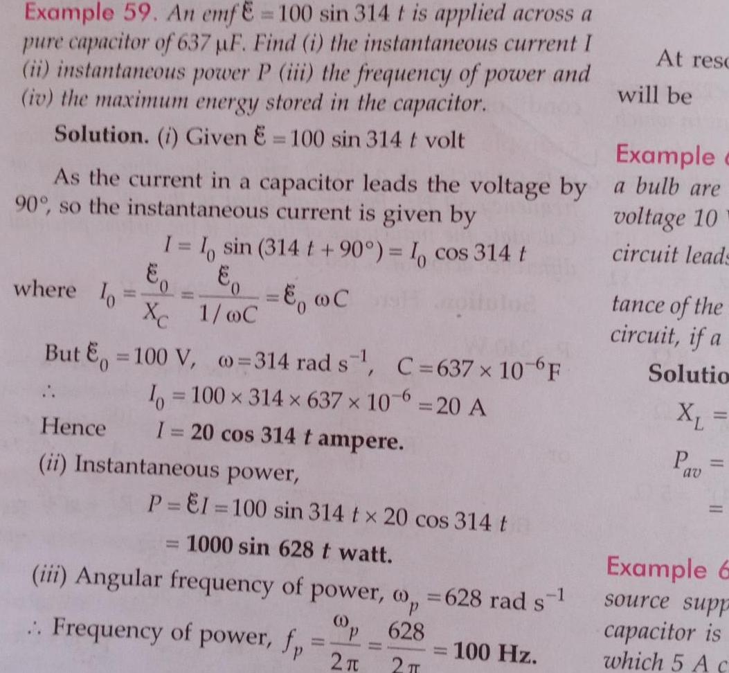 [ANSWERED] Example 59 An emf 100 sin 314 t is applied across a pure ...