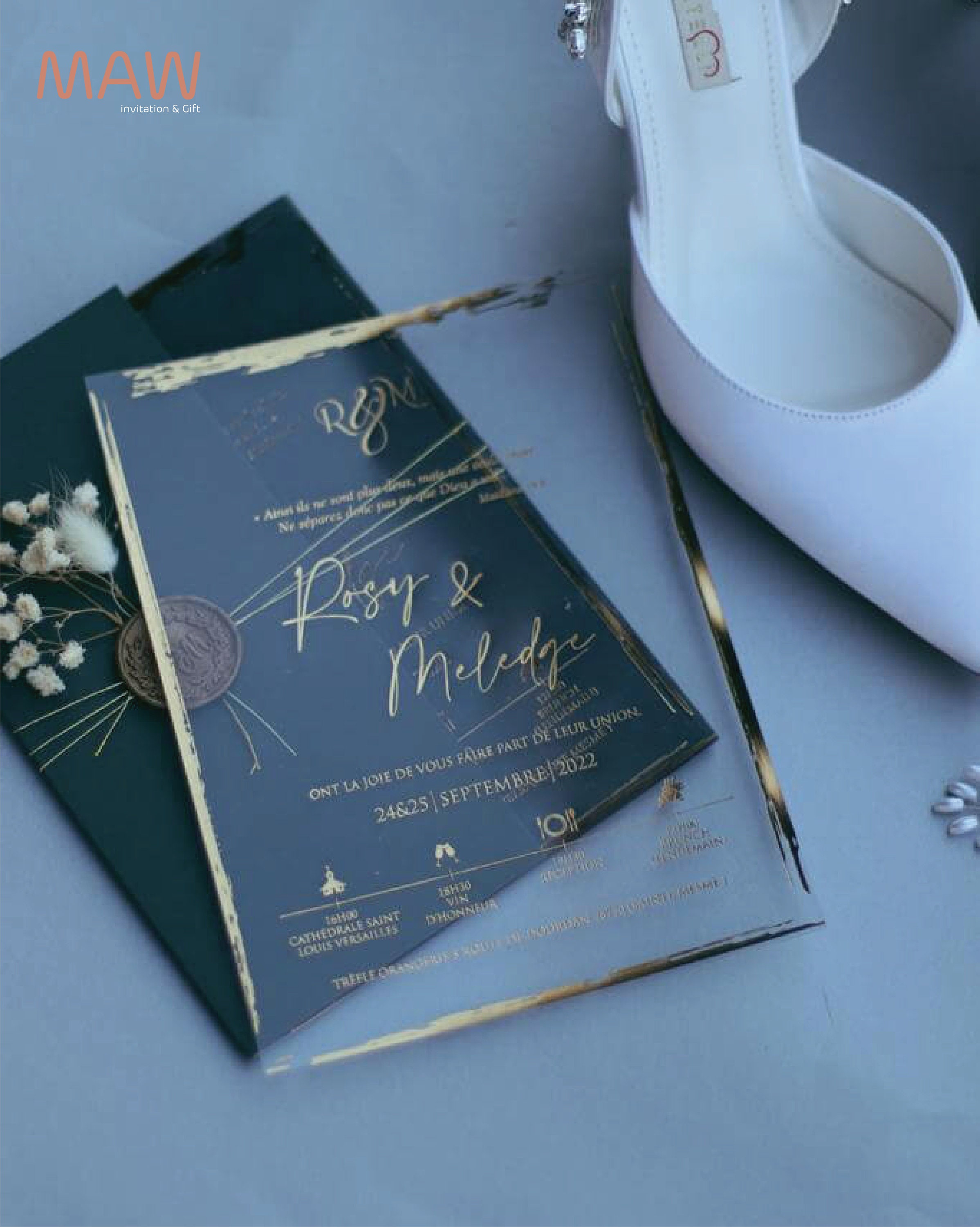 Clear Acrylic Wedding Invitations With Gold Foil Detailing Wax Seal ...