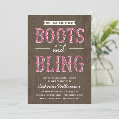 Boots and Bling | Glitter-Look Bachelorette Party Invitation | Zazzle