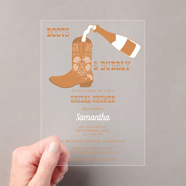 Boots Bubbly Rustic Western Country Bridal Shower Acrylic Invitations ...