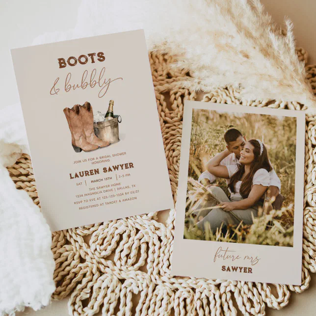Watercolor Photo Boots & Bubbly Bridal Shower Invitation | Zazzle