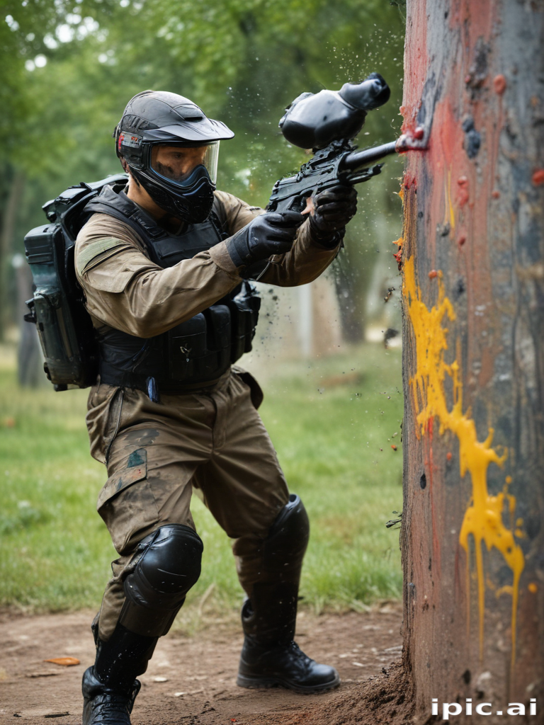 Action-Packed Scene of a Tactical Operator Engaging in Paintball Combat
