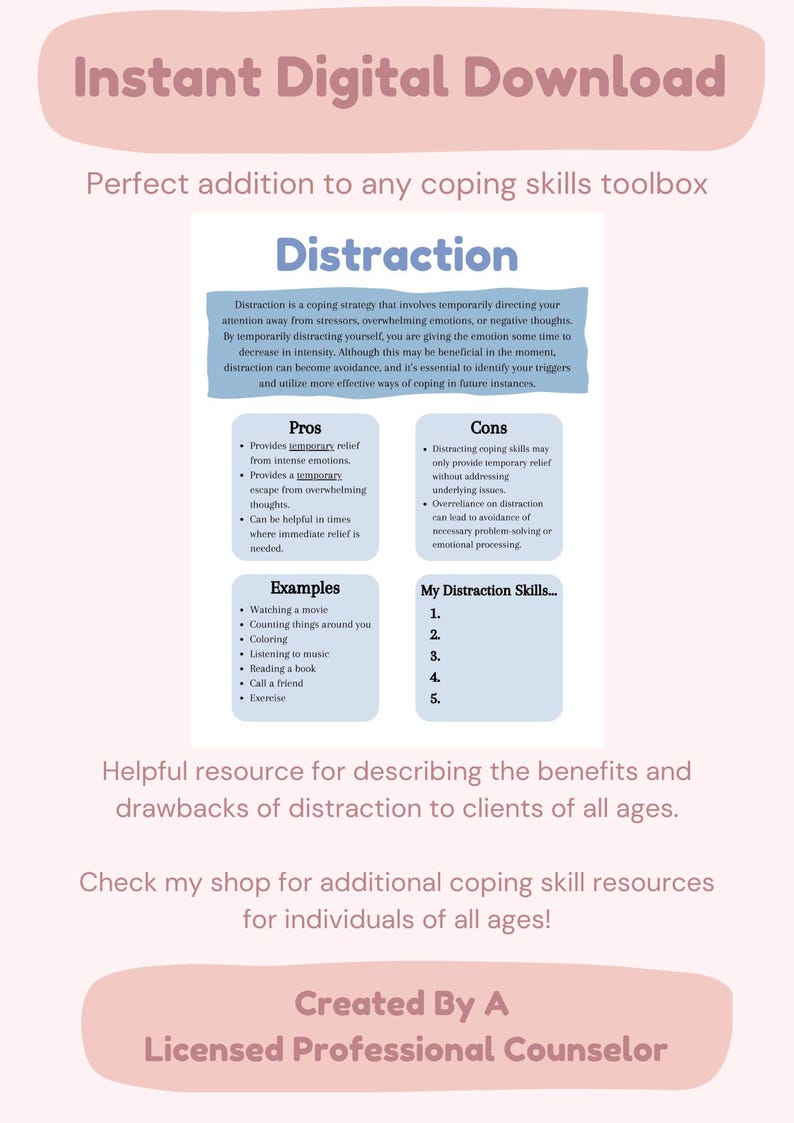 Distraction Coping Skills Handout: Mental Health, CBT, DBT (PDF) - Etsy