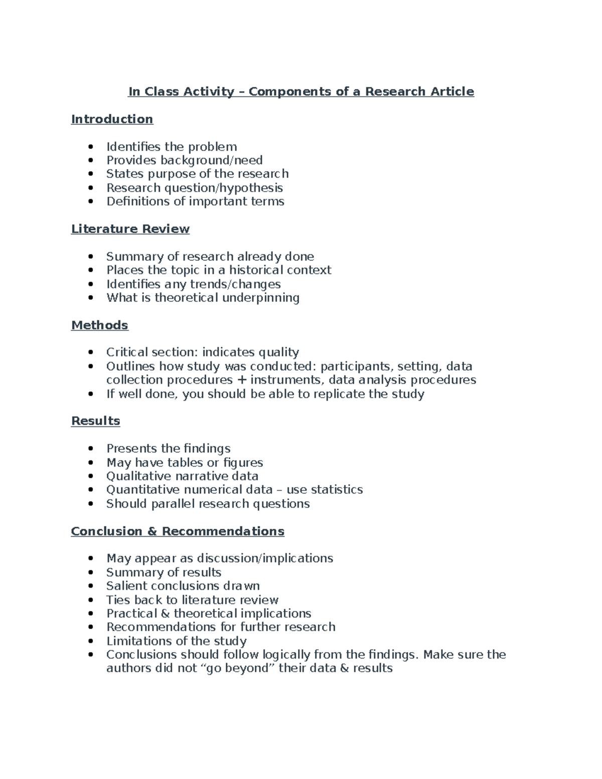 In Class Activity- Components of a Research Article - In Class Activity ...