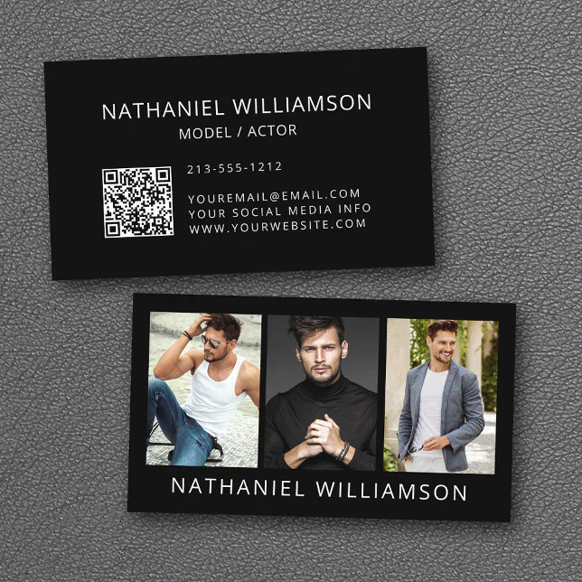 Modern 3 Photos Model and Actor QR Code Business Card | Zazzle