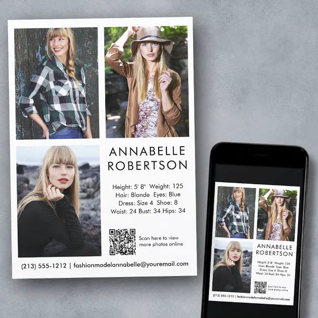 Model Actor QR Code 5 Photos Pro Comp Card | Zazzle