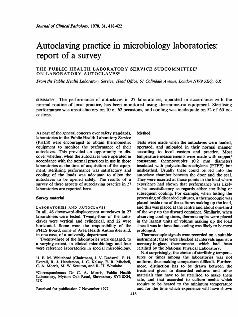 Autoclaving Practice in Microbiology Laboratories Report of A Su 1978 ...
