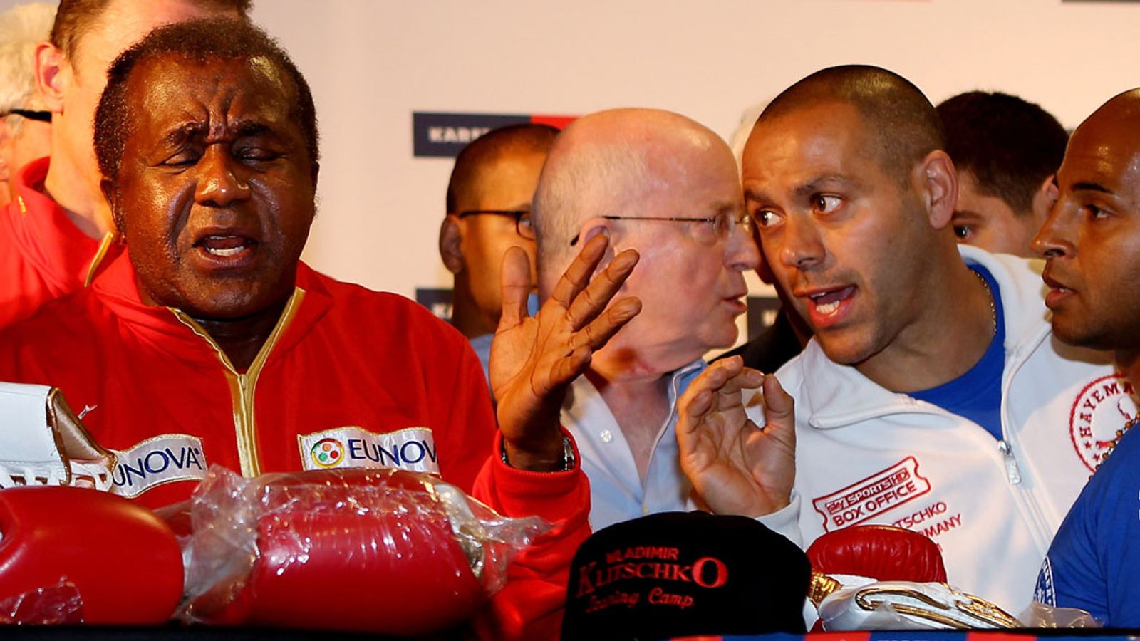 British boxer Dereck Chisora (R) argues with Haye manager Adam Booth ...