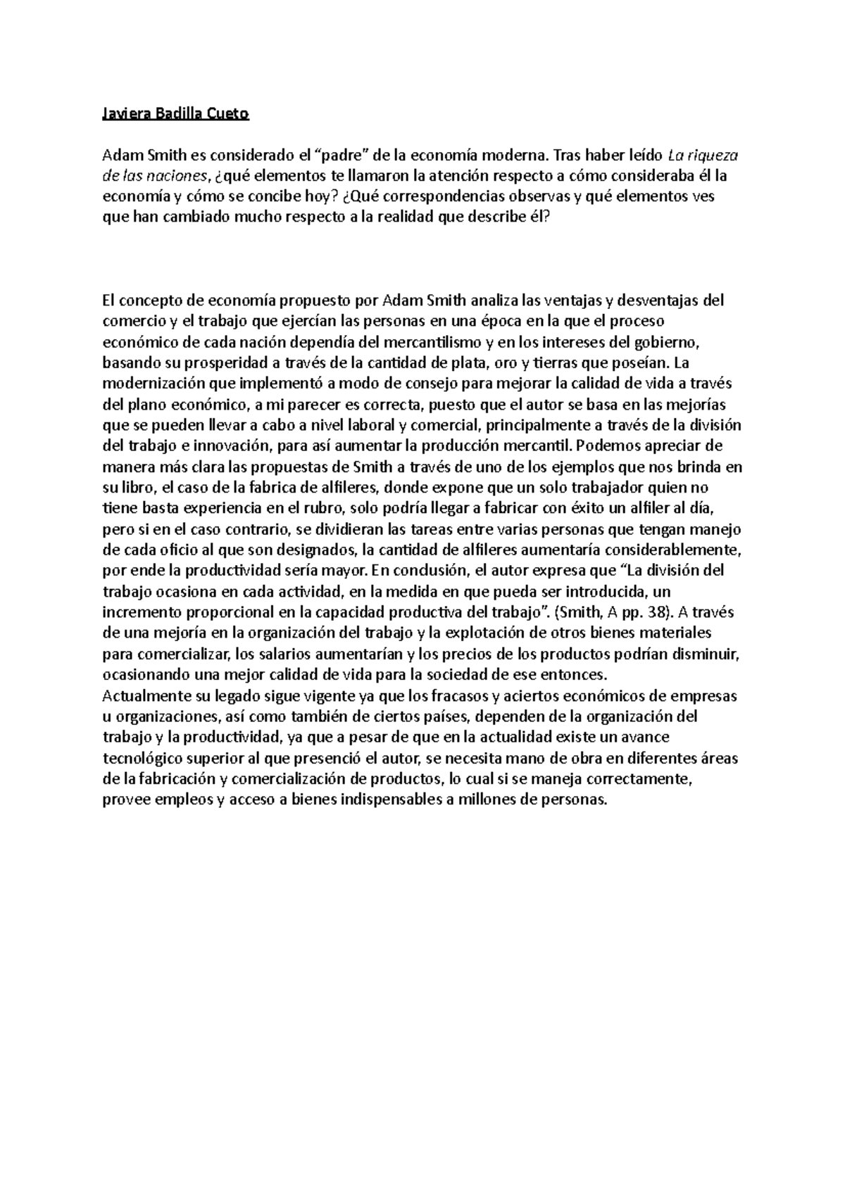 Comentario crítico - Javiera Badilla Cueto Adam Smith es considerado el ...