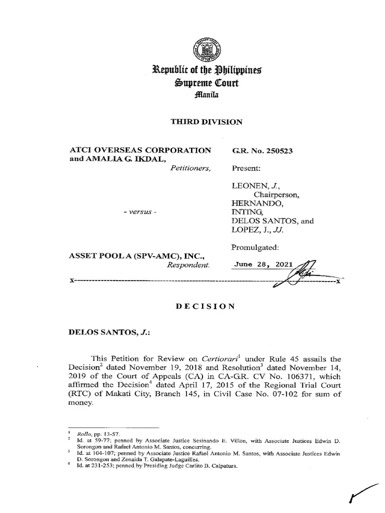 ATCI Overseas Corporation and Amalia G. Ikdal vs. Asset Pool A (SPV-AMC ...