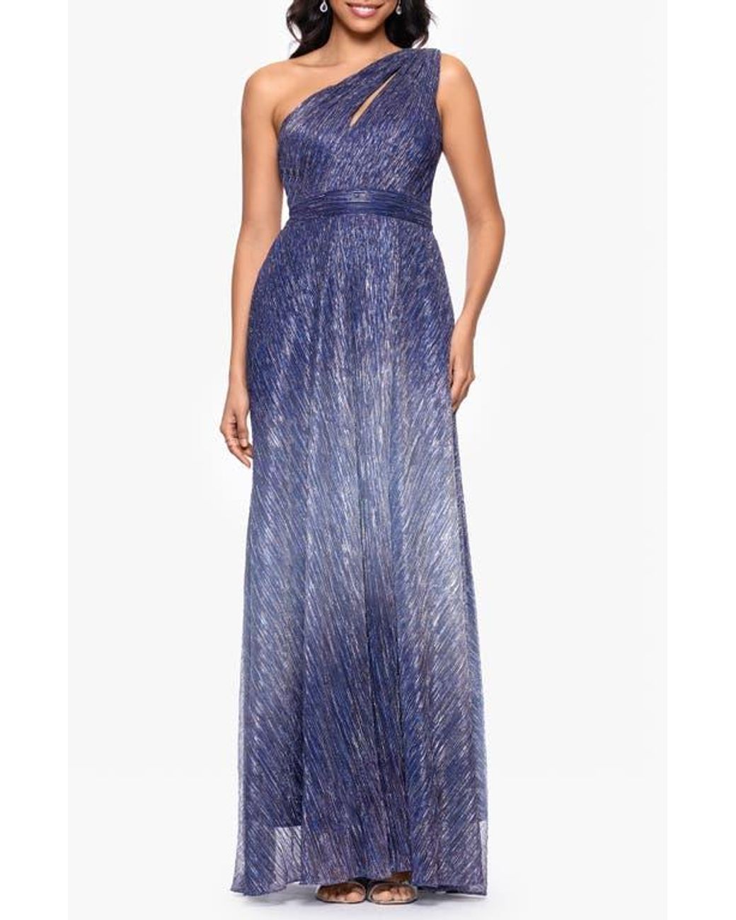 Betsy & Adam Ombré Crinkle Metallic One-Shoulder Gown in Blue | Lyst