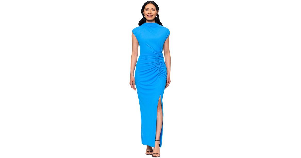 Betsy & Adam Mock Neck Cap Sleeve Ruched Gown in Blue | Lyst
