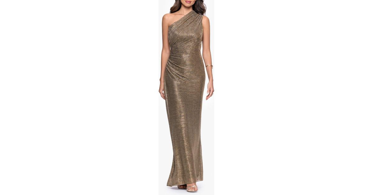 Betsy & Adam One-Shoulder Metallic Crinkled Column Gown in Brown | Lyst