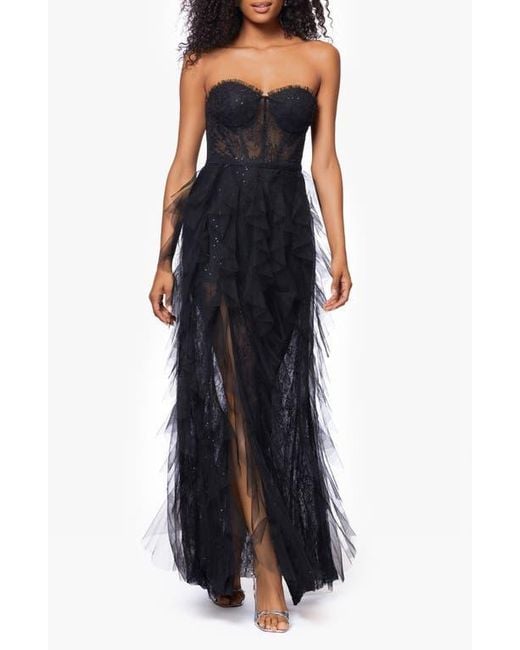 Betsy & Adam Sequin Lace Strapless Gown in Black | Lyst