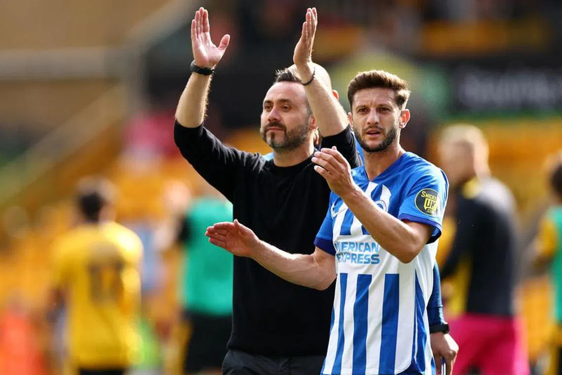 Brighton and Hove Albion's Adam Lallana (right) celebrates scoring ...