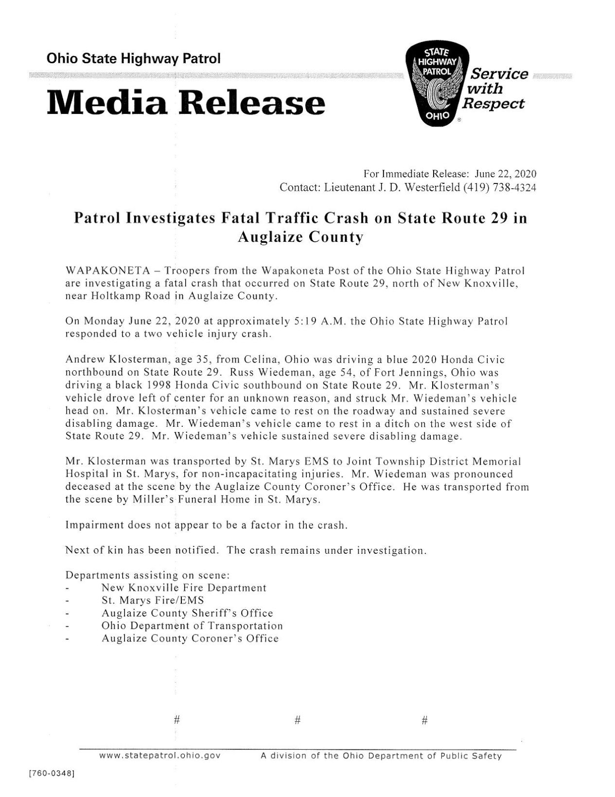 A Fort Jennings man was killed in a two car crash in Auglaize County ...