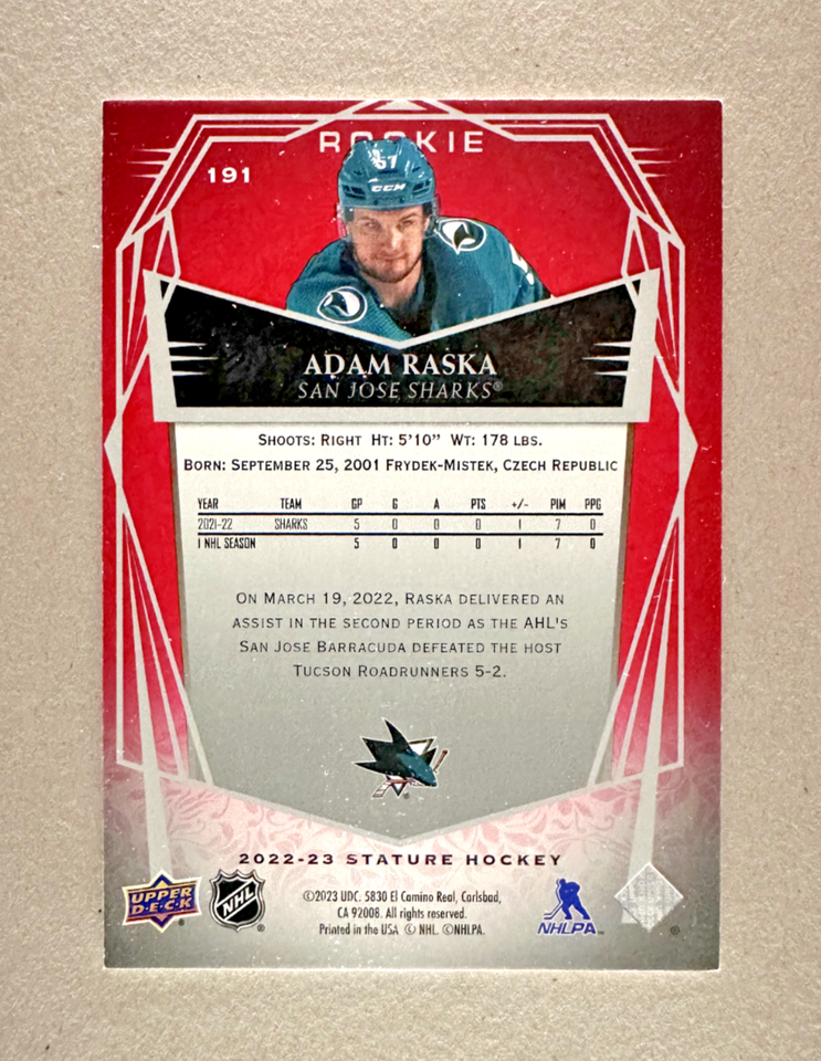 Adam Raska 2022-23 Upper Deck Stature Rookie RC Red /25 San Jose Sharks ...