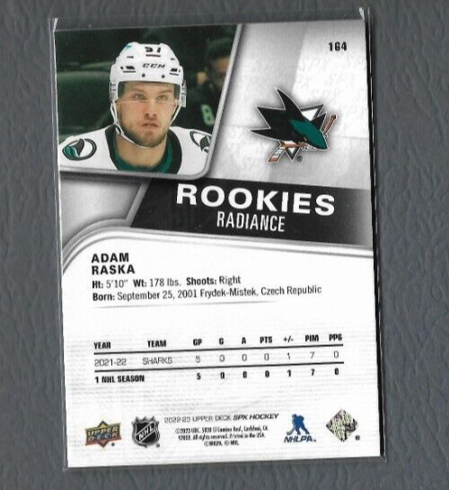2022-23 SPx Rookies Radiance Adam Raska Serial'd/100 RC, San Jose ...