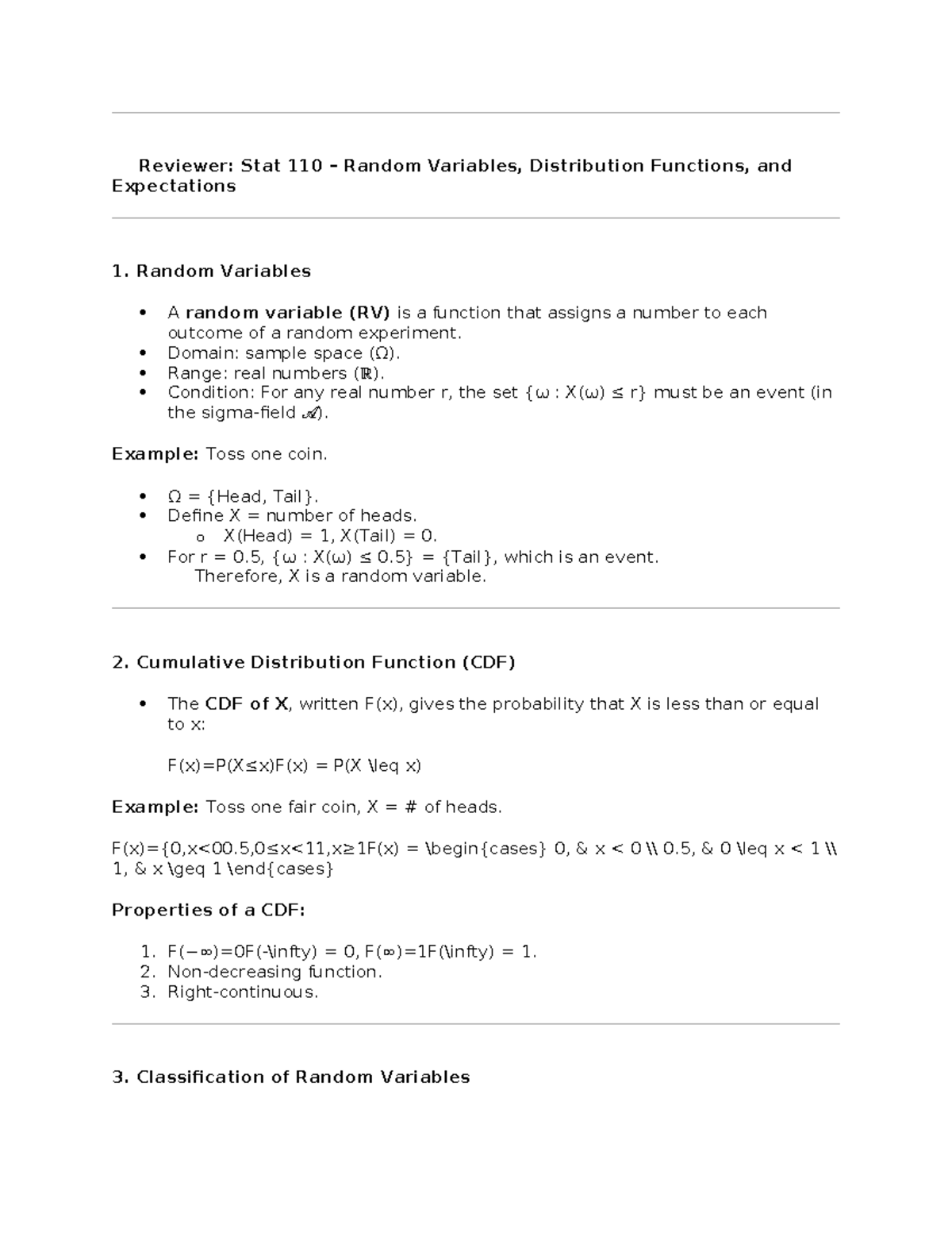 Stat 110 Module 2 Notes: Random Variables & Distribution Functions ...
