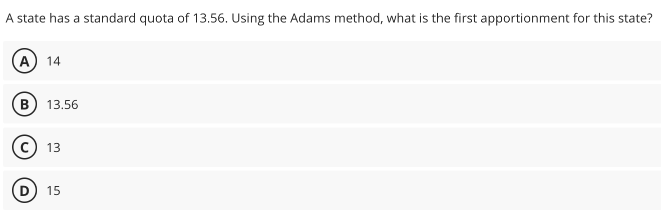 a state has a standard quota of 13.56 . using the adams method, what is ...