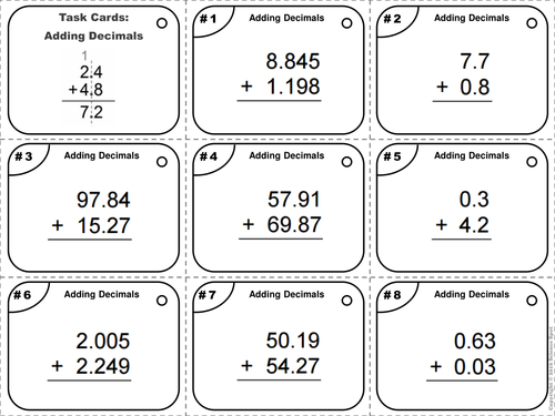 Adding Decimals - 30 Task Cards by Worksheet Central | TPT