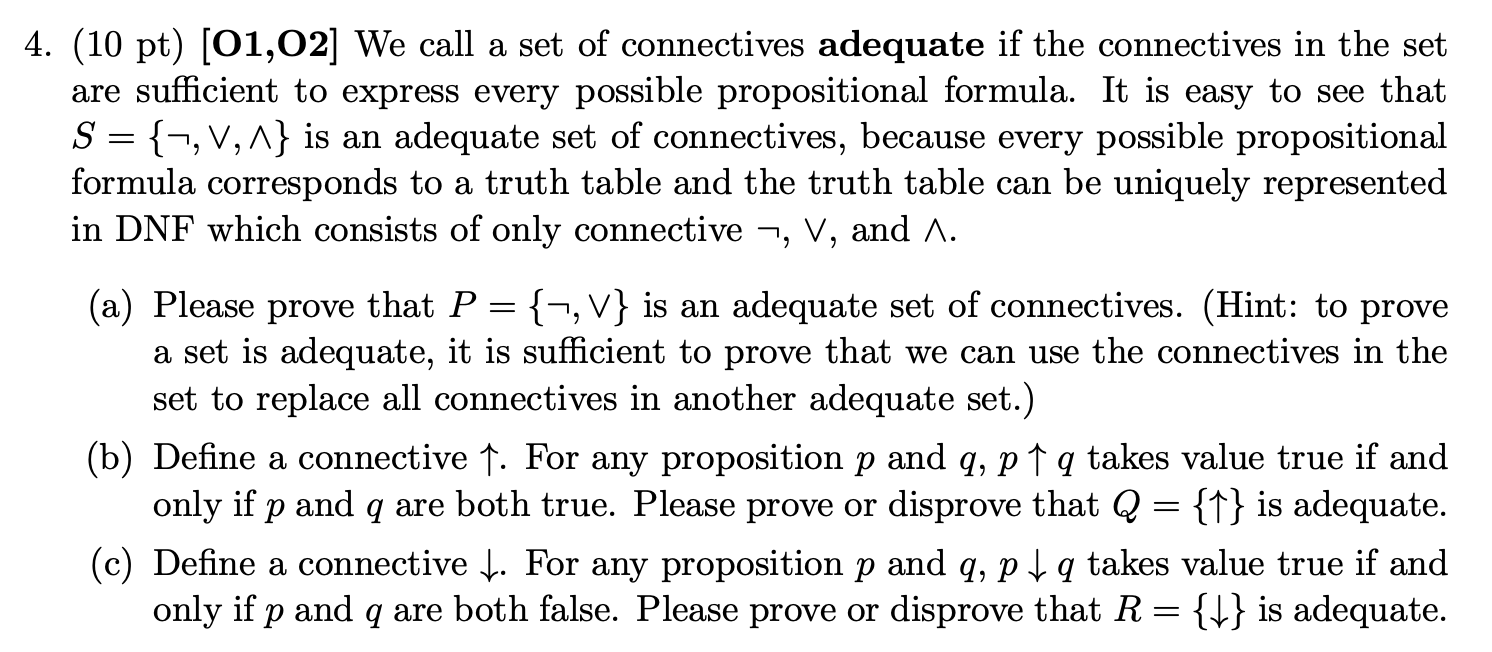 Solved (10 pt) [O1,O2] We call a set of connectives adequate | Chegg.com
