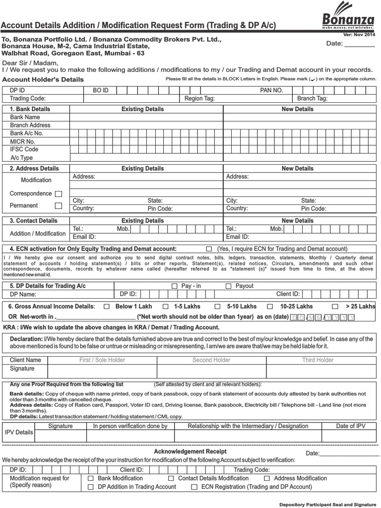 Account Details Addition, Modification Request Form Broking & Demat Acc ...
