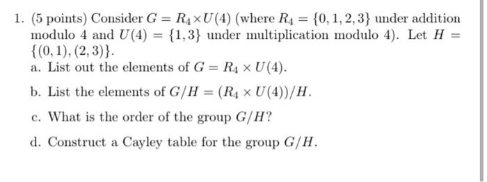 Solved 1. (5 points) Consider G=R4×U(4) (where R4={0,1,2,3} | Chegg.com
