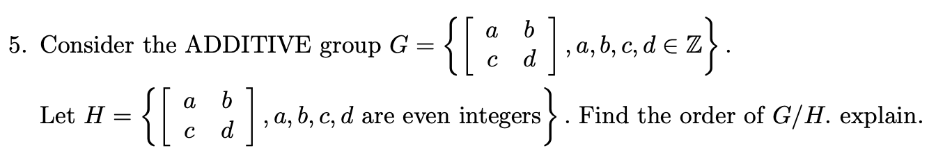 Solved Consider the ADDITIVE group G={[acbd],a,b,c,d∈Z} Let | Chegg.com