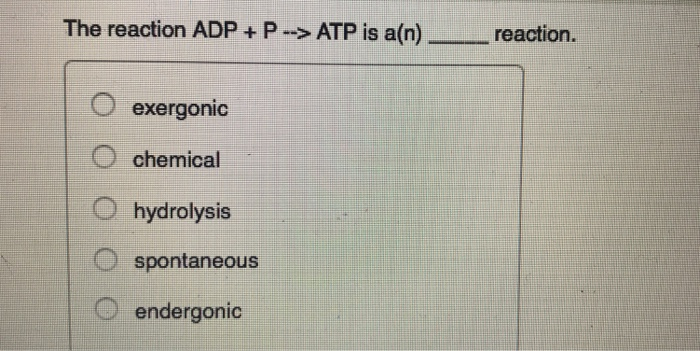 Solved The reaction ADP + P--> ATP is a(n) reaction. O | Chegg.com