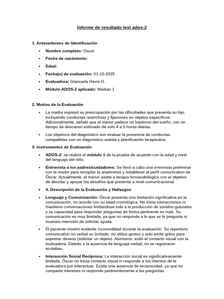 Informe de Resultado Test Ados Oscar | PDF | Autismo | Comunicación